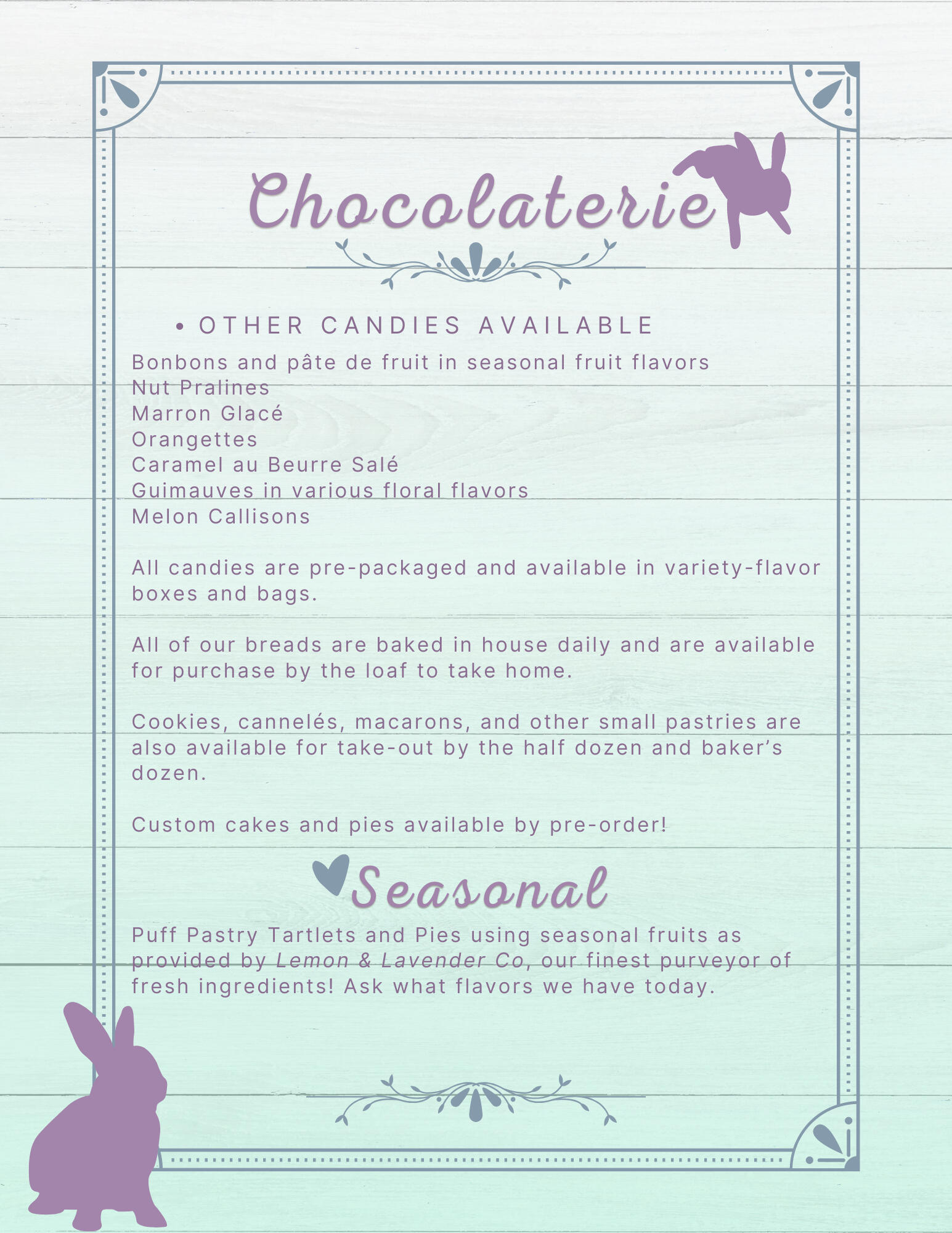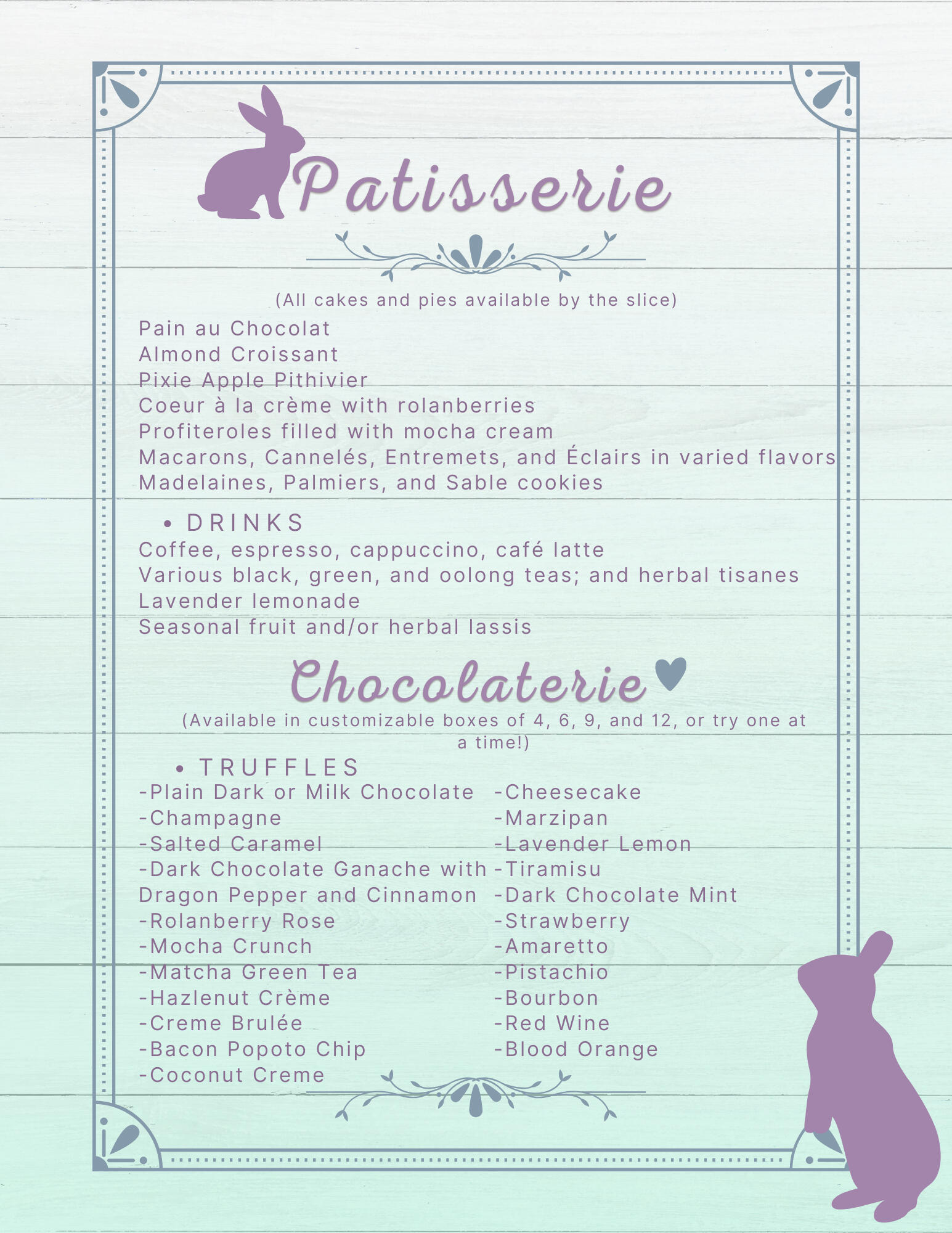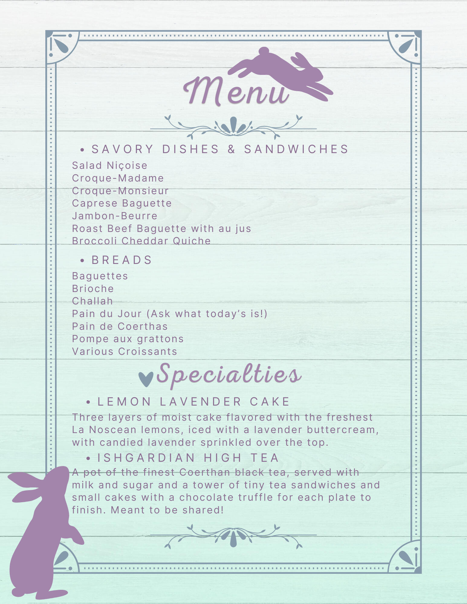 Our chef's mother was the head chef at one of the noble houses in Ishgard, and while he grew up to be a butler, he still studied the culinary arts beside her as he grew up and developed a taste for fine dining, especially patisserie and chocolates. He embraces both new and old flavors and incorporates them into the traditional cafe fare he offers here at the bakery, especially offering seasonal fare using the freshest ingredients provided by the exotic herb shop, Lemon & Lavender Co.